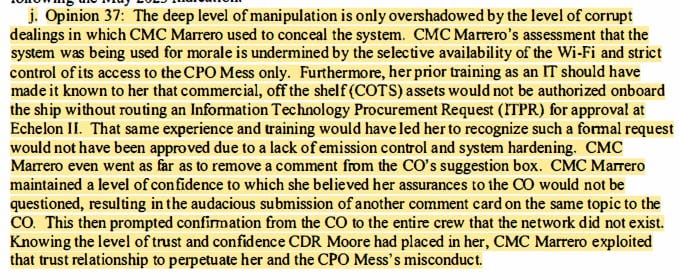 During that chiefs mess meeting, Marrero told her fellow enlisted leaders that Moore knew about their secret Wi-Fi, and two chiefs subsequently removed the dish from the O-5 weatherdeck.