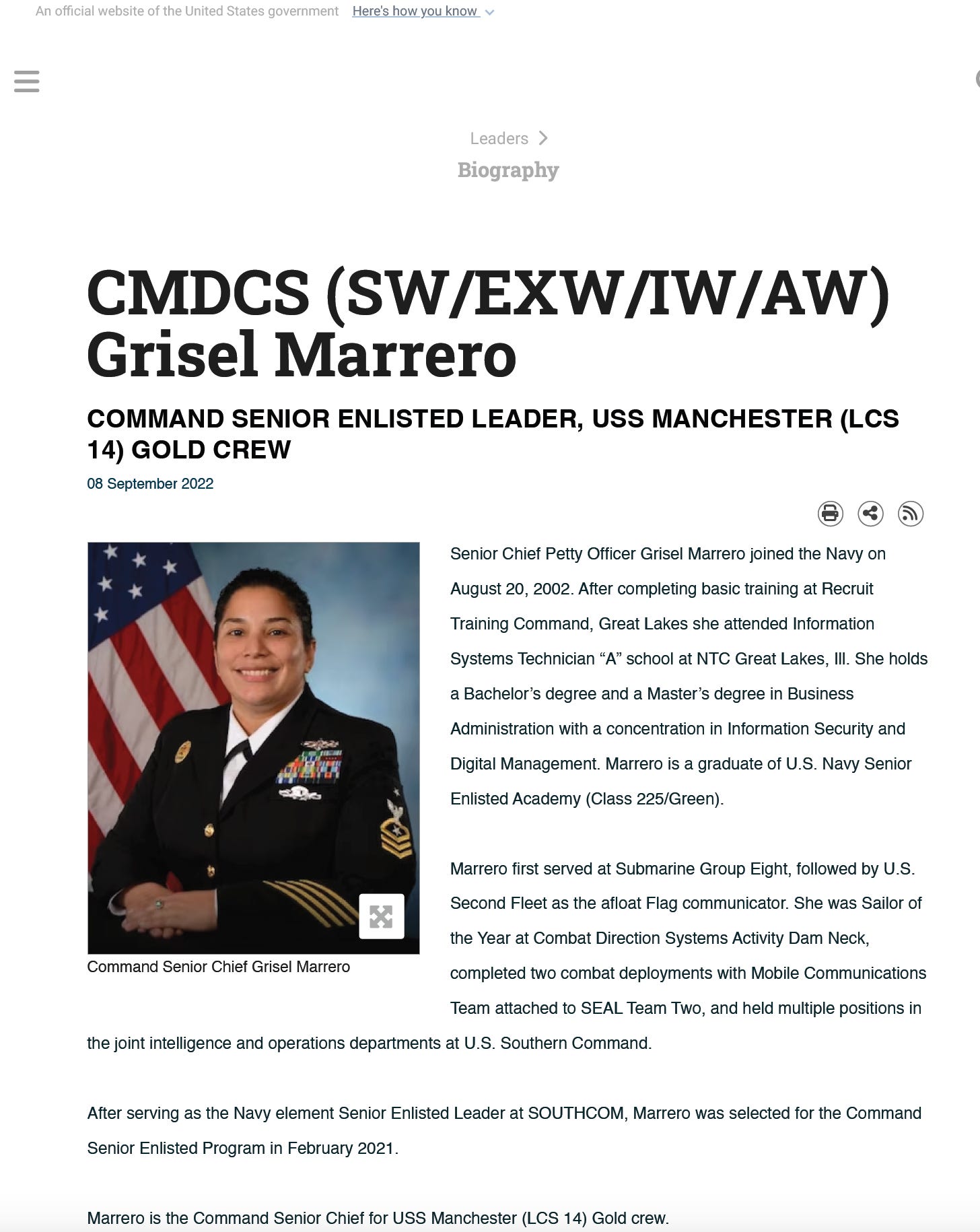 Here is a funny side-note, as of the evening of September 3rd, Senior Chief Marrero’s bio showing her as still the Command Senior Chief is still on SURFPAC’s website.