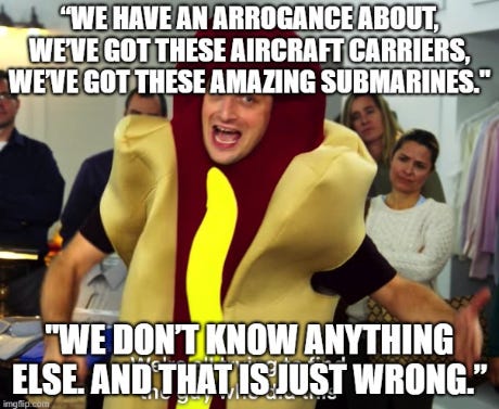 “The U.S. Navy is arrogant,” said Lorin Selby, who retired this summer as a rear admiral and the chief of naval research after a 36-year career in which he helped run many of the Navy’s major acquisition units. “We have an arrogance about, we’ve got these aircraft carriers, we’ve got these amazing submarines. We don’t know anything else. And that is just wrong.”