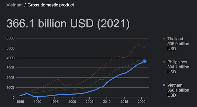 To put $101 billion in perspective, Vietnam’s exports to the US equal a quarter of its gross domestic product. They’re growing rapidly; as recently as 2018 the US only imported $49 billion in goods from Vietnam.