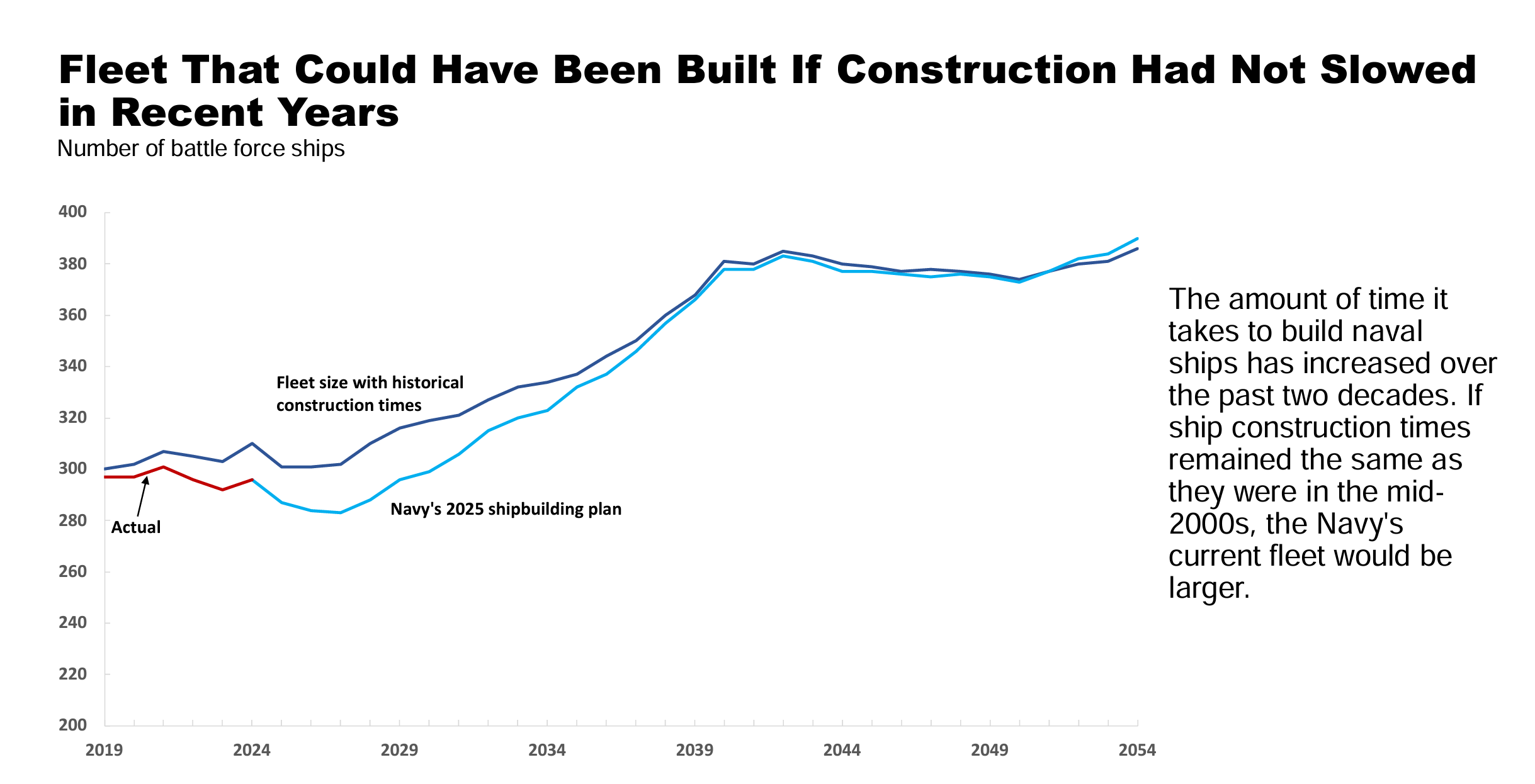 Note the delta between ‘norms’ and what we actually are able to do is growing, not closing. As with most things: what are we doing to change how we manage programs, how we build out ships, how we expand capacity, how we grow our skilled workforce in our shipbuilding industry?