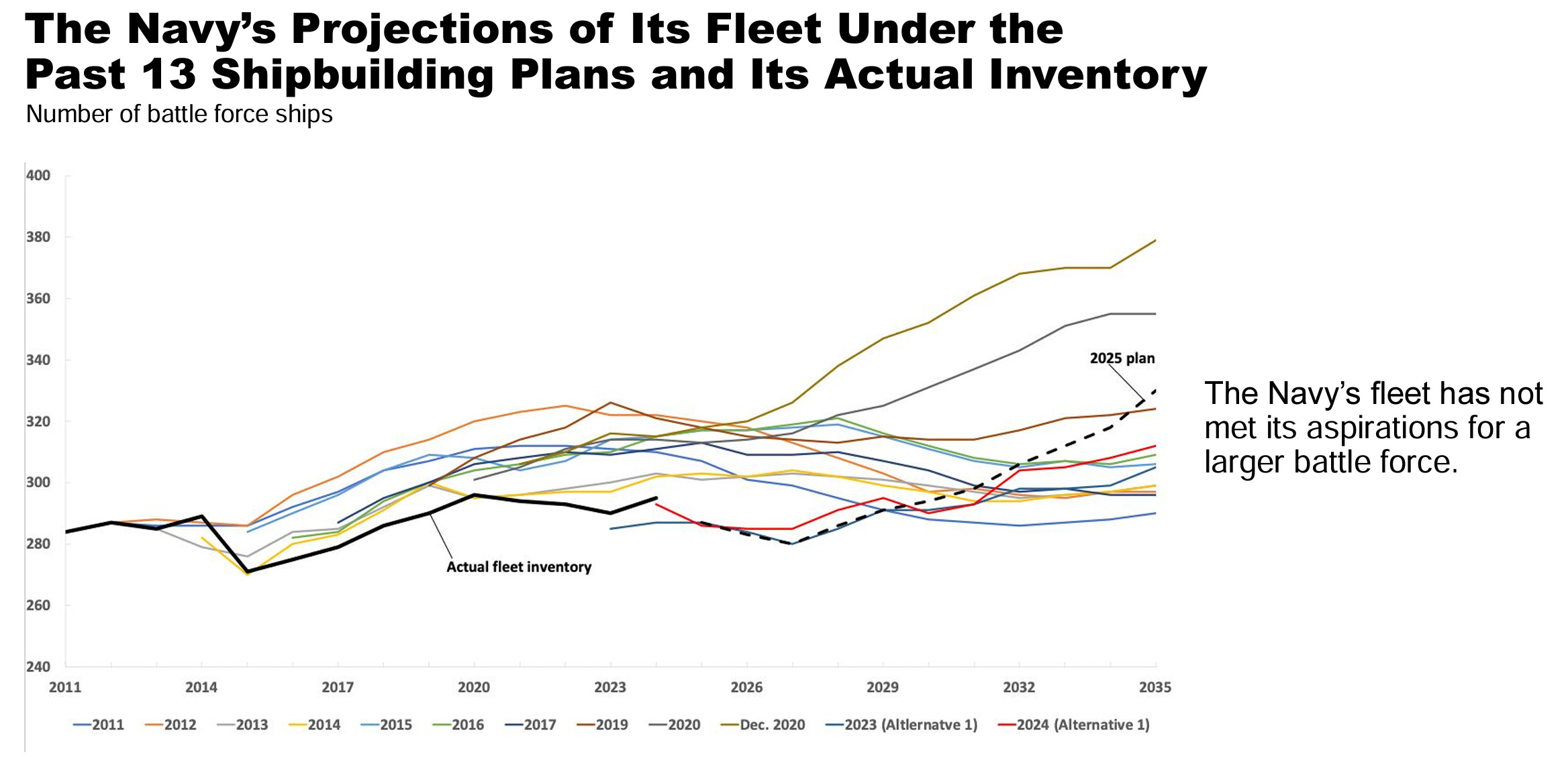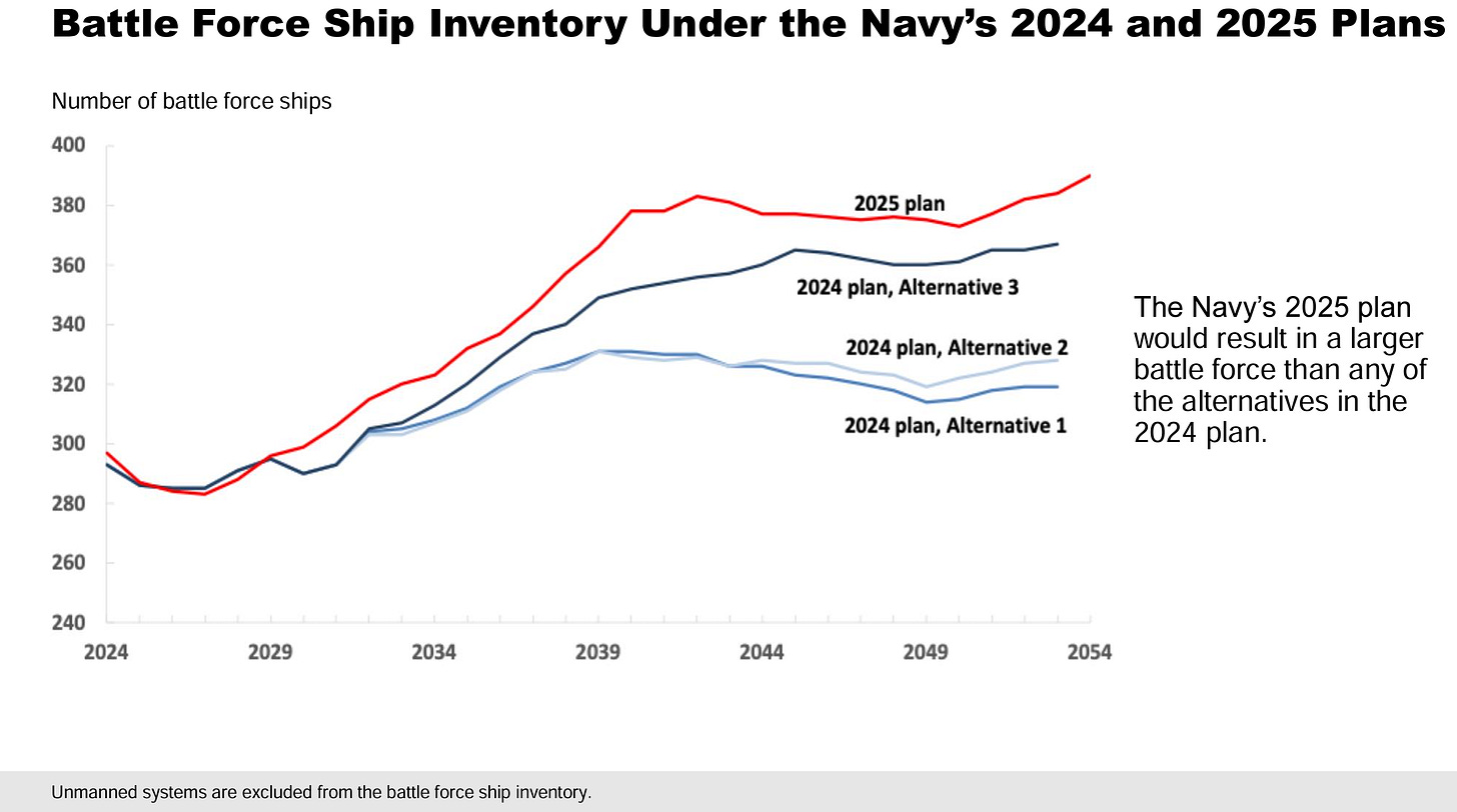 I am less interested in the view of the fleet in 2029 provided by 2023 (Alternative 1) and 2023 (Alternative 2) as I am in somebody telling me why all the other 30-year shipbuilding plans were so incredibly and foolishly optimistic.