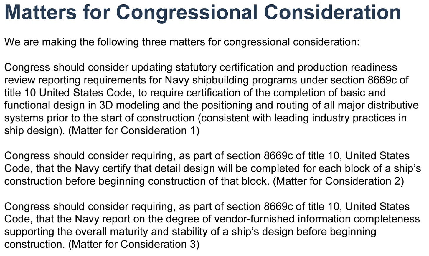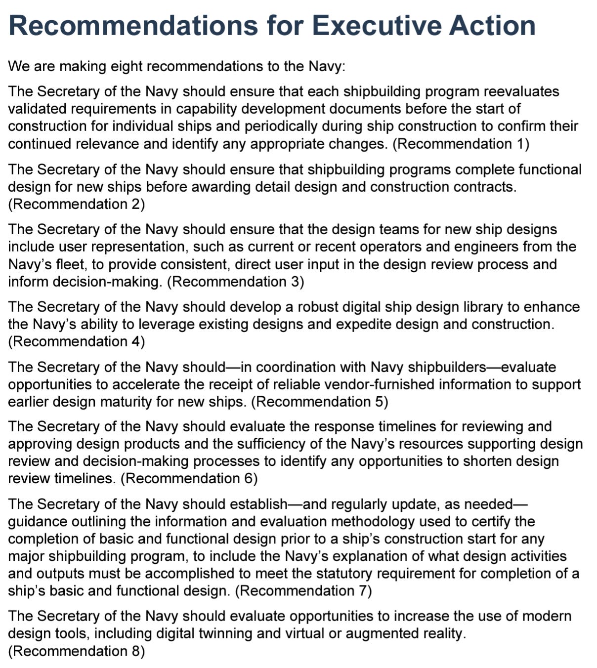 We all know what we are doing now does not work, and the Navy is incapable of fixing itself. As such, why not adopt the three recommendation to Congress and the eight for the Navy?