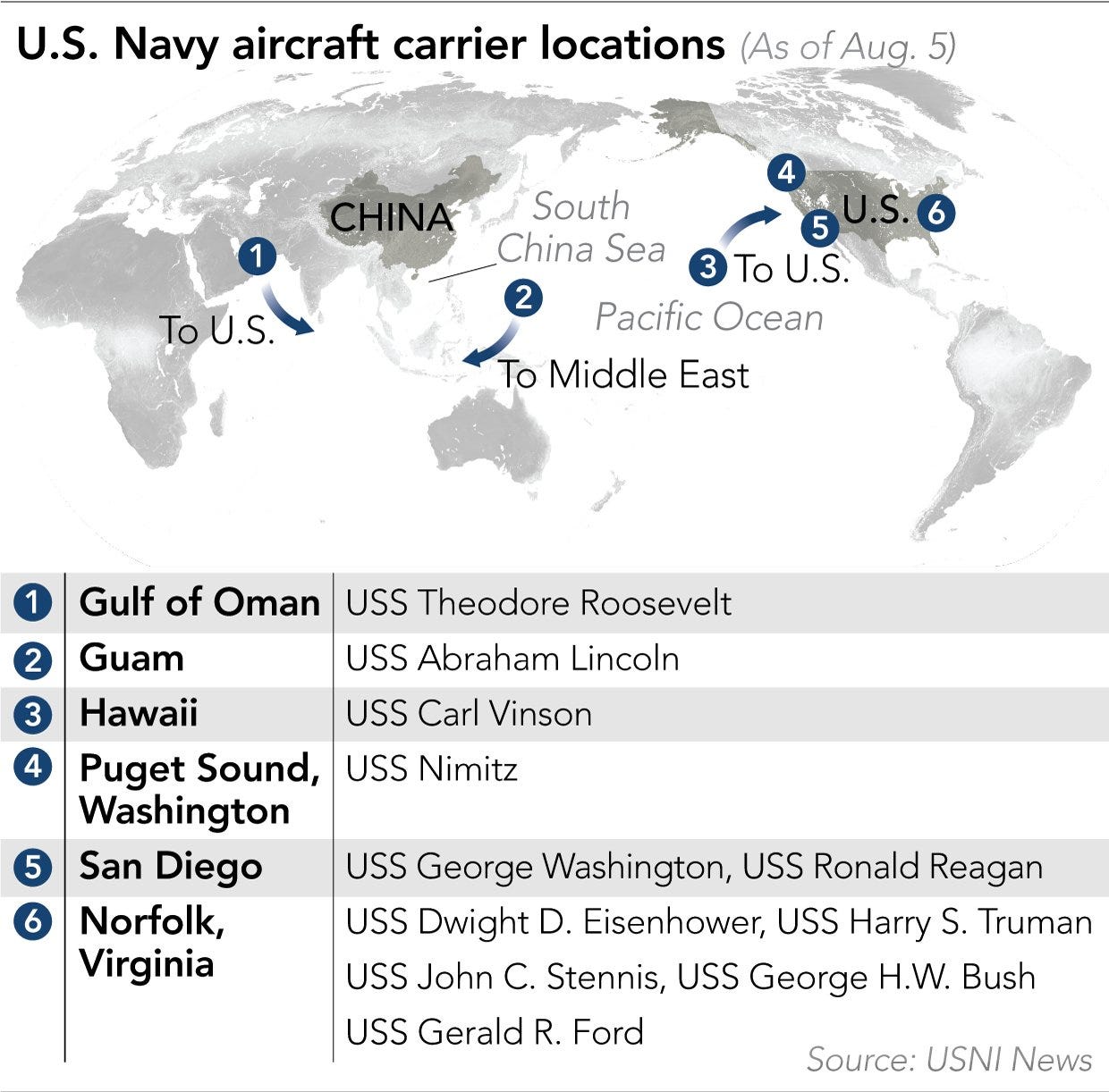 USS Theodore Roosevelt — Based in San Diego, it deployed to Indo-Pacific Command in January and was then redirected to relieve the Eisenhower.