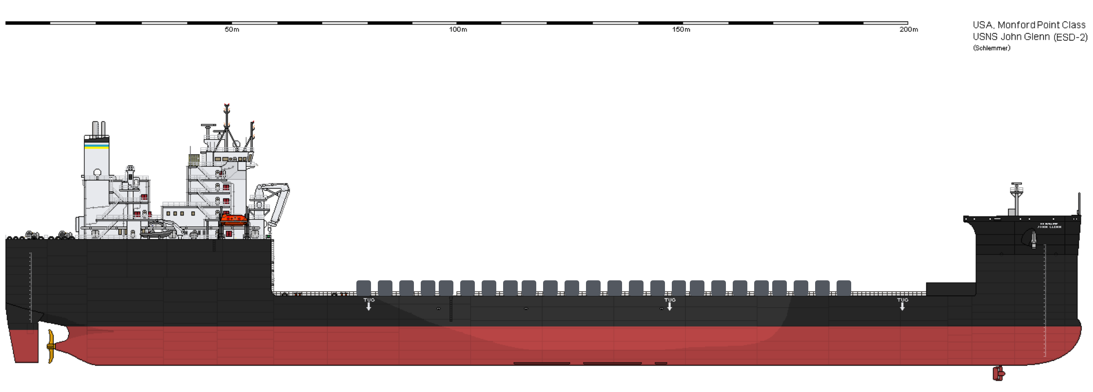 I give you the US Navy’s Expeditionary Transfer Dock USNS John Glenn (T-ESD-2). She and her sister ship are in mothballs right now, tanned, rested, and ready.