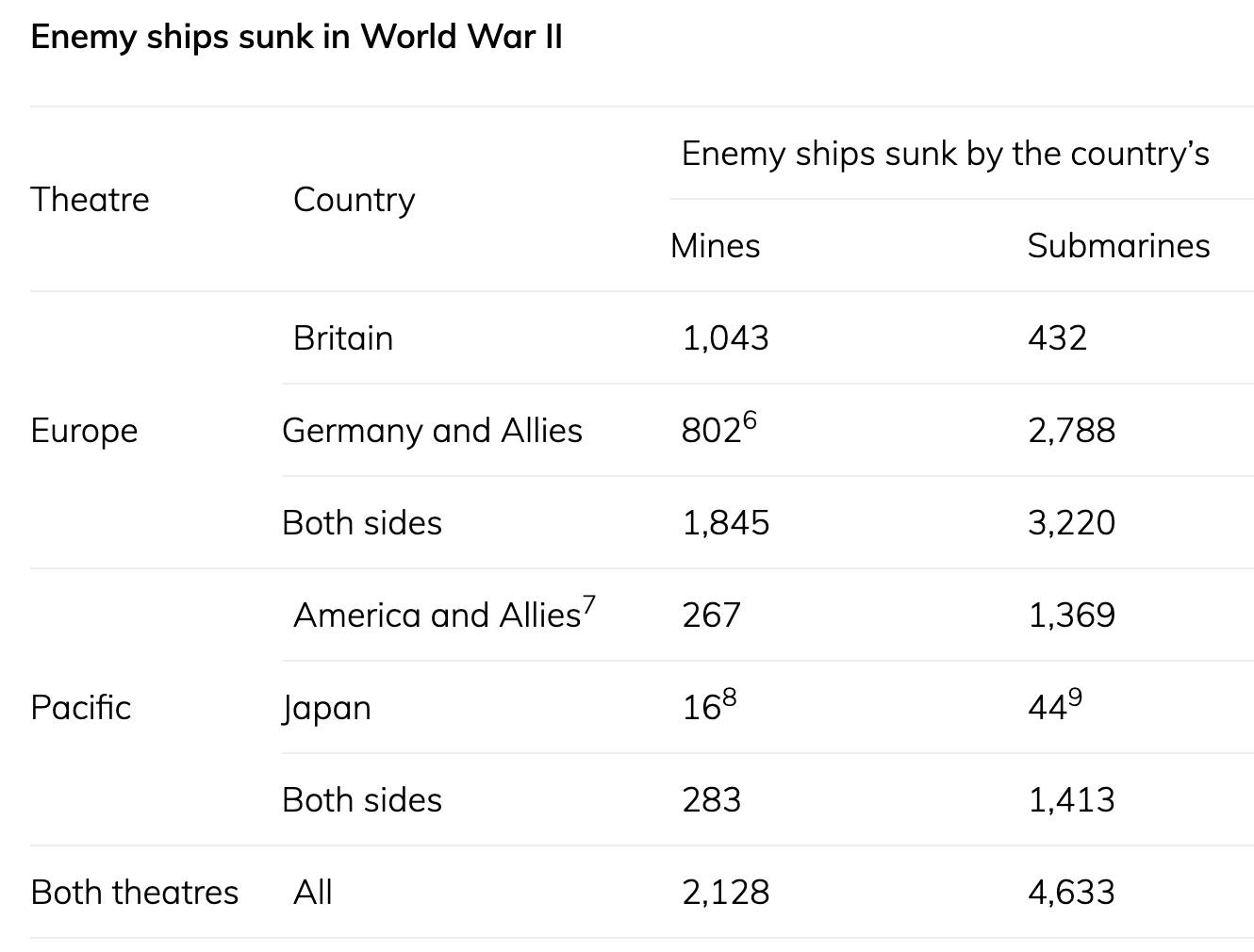 Mike Turner over at the Naval Historical Society of Australia has a great article titled The Effectiveness of Torpedoes and Mines in World War II, that is a good place as any to start. In it, you can find this helpful graphic.