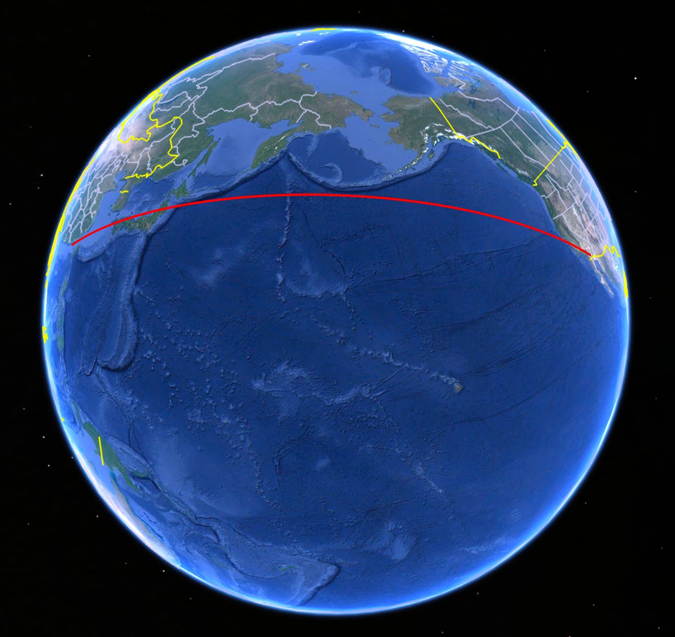 That red line is the great circle route from San Diego to the PRC shoreline opposite Taiwan, about 6,150nm. I’ll let you do the 20-kt SOA math for yourself.