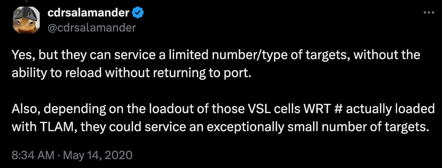 As an old TLAM guy who managed to empty every operational TLAM out of one DDG and left a few DD & CG with only a handful of D1 & D2 warhead TLAM left - the inability to reload puts you in a pickle.
