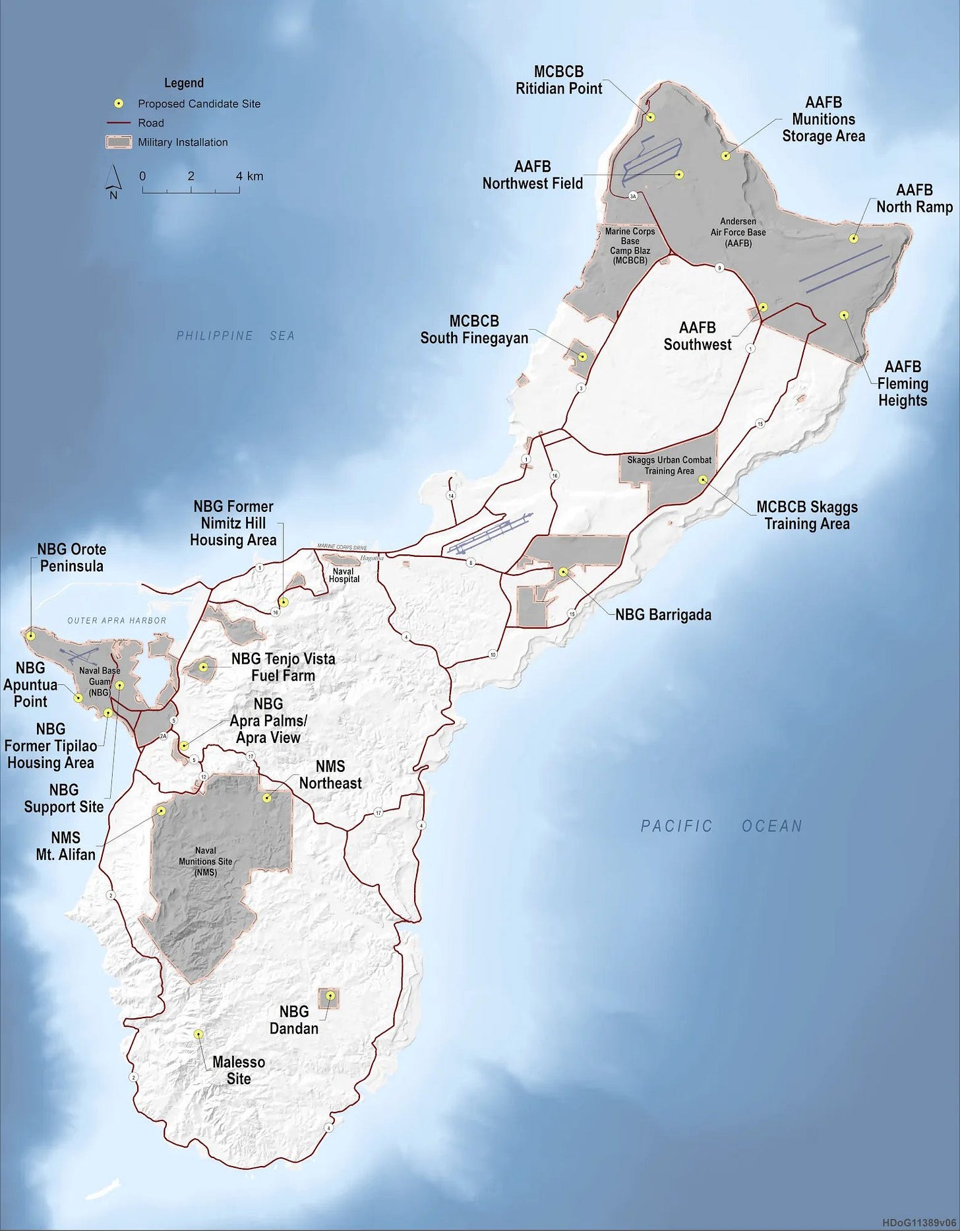 Of the proposed sites, eight will be at U.S. Naval Base Guam (including the NBG Munitions Site), six will be at Anderson Air Force Base, and two will be at Marine Corps Base Camp Blaz.