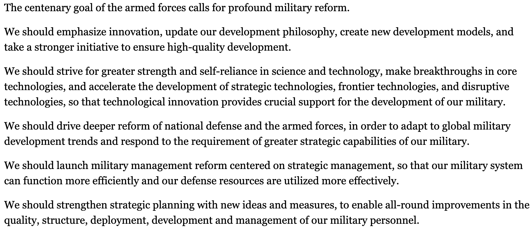 It was stated that modernizing national defense and the armed forces is an integral part of Chinese modernization. We must maintain the Party's absolute leadership over the people's armed forces and fully implement the strategy of strengthening the military through reform to provide a strong guarantee for realizing the centenary goal of the People's Liberation Army in 2027 and achieving basic modernization of national defense and the armed forces. We will improve the systems and mechanisms for leading and managing the people's armed forces, further reform joint operations systems, and deepen military-civilian reforms.
