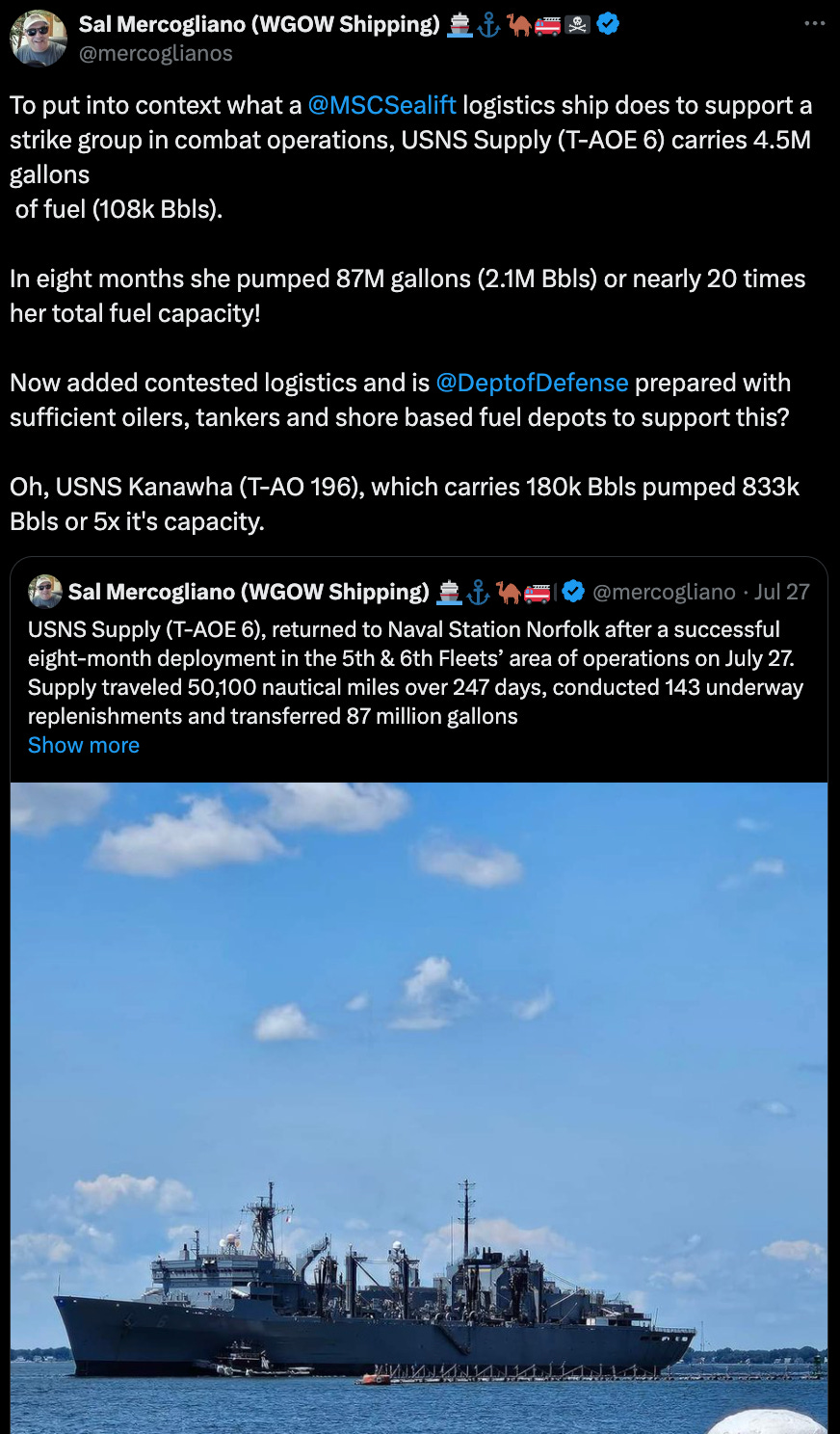 However…they are unarmed and for a vast majority of the time, unescorted to and from the ports they use to “top off” before returning to the fleet to transfer the supplies that keeps the fleet in the fight.